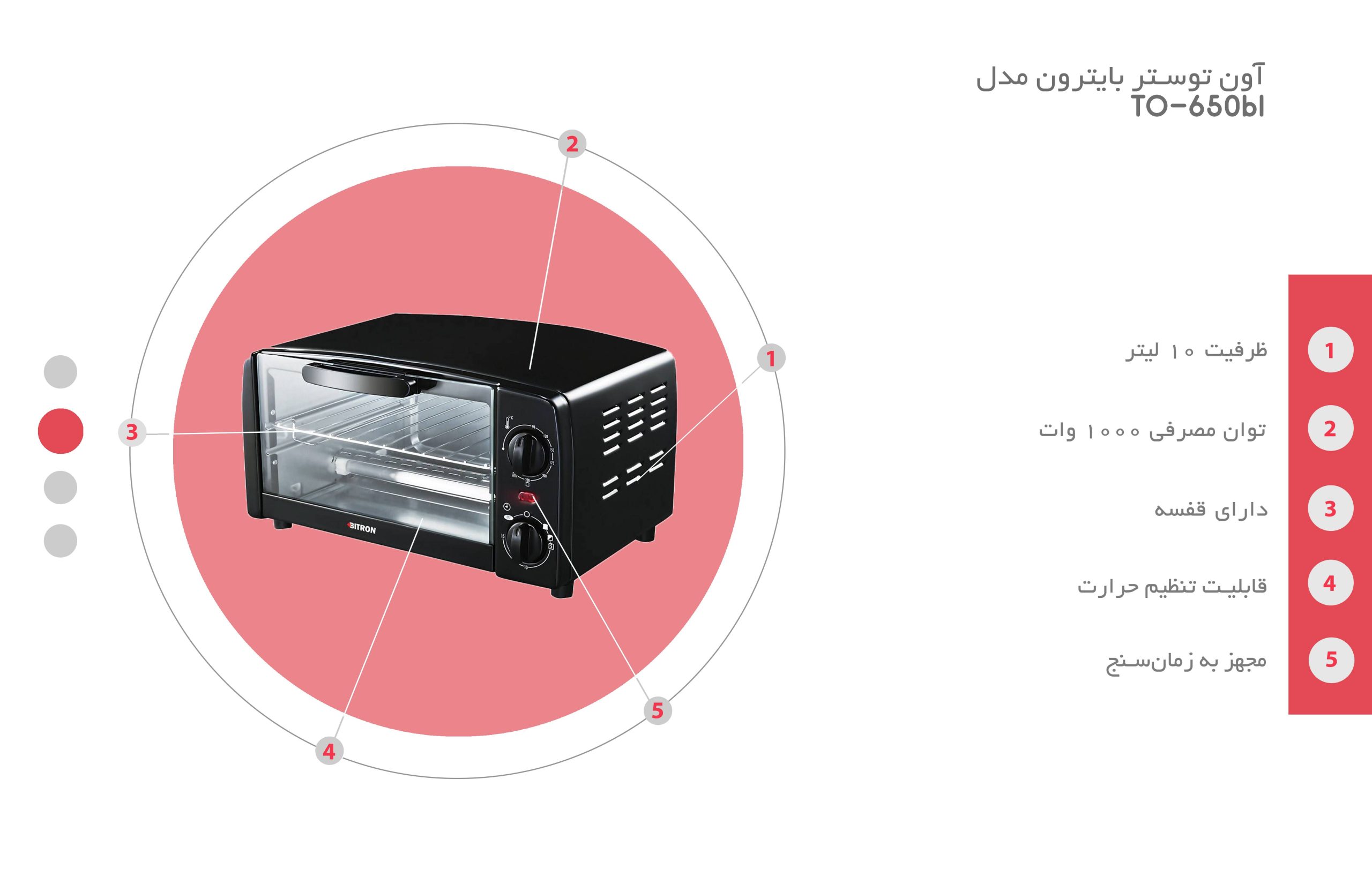 امروزه آون توسترها به یکی از وسایل پرکاربرد در هر خانهای تبدیل شدهاند و بسیاری از خانوادهها، یکی از این دستگاهها را برای آشپزخانه خود تهیه کردهاند. یکی از شرکتهایی که در زمینه تولید لوازم آشپرخانه فعالیت دارد شرکت بایترون است. یکی از محصولات این شرکت، آون توستر مدل TO-650bl است. این دستگاه حجم کمی دارد و وزن آن سبک است. ظرفیت این دستگاه ۱۰ لیتری است. این دستگاه دارای یک قفسه است و میتوانید به راحتی از آن استفاده نمایید. یکی از ویژگیهای این دستگاه قابلیت تنظیم حرارت است و دمای آن را میتوانید تا ۲۳۰ درجه تنظیم نمایید. همچنین با استفاده از قابلیت تایمر در این دستگاه میتوانید زمان مورد نظر برای آن را تعیین نمایید. تایمر این دستگاه حداکثر ۱۵ دقیقهای است و قابلیت گریل کردن را نیز میتوان به قابلیتهای این دستگاه اضافه کرد. توان مصرفی این دستگاه ۱۰۰۰ وات است. اگر به دنبال یک آون توستر هستید میتوانید این دستگاه را انتخاب نمایید.
